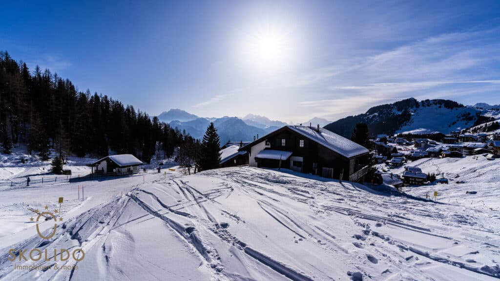 The holiday flat is located in the attic of the ‘Chämihitta’ house, right next to the ski slope. It has two bedrooms with double beds, a living room, bathroom and kitchen. The south-facing balcony offers a panoramic view over the Rhone Valley and the Valais mountains, including the Matterhorn. The flat can accommodate a total of 4 people.